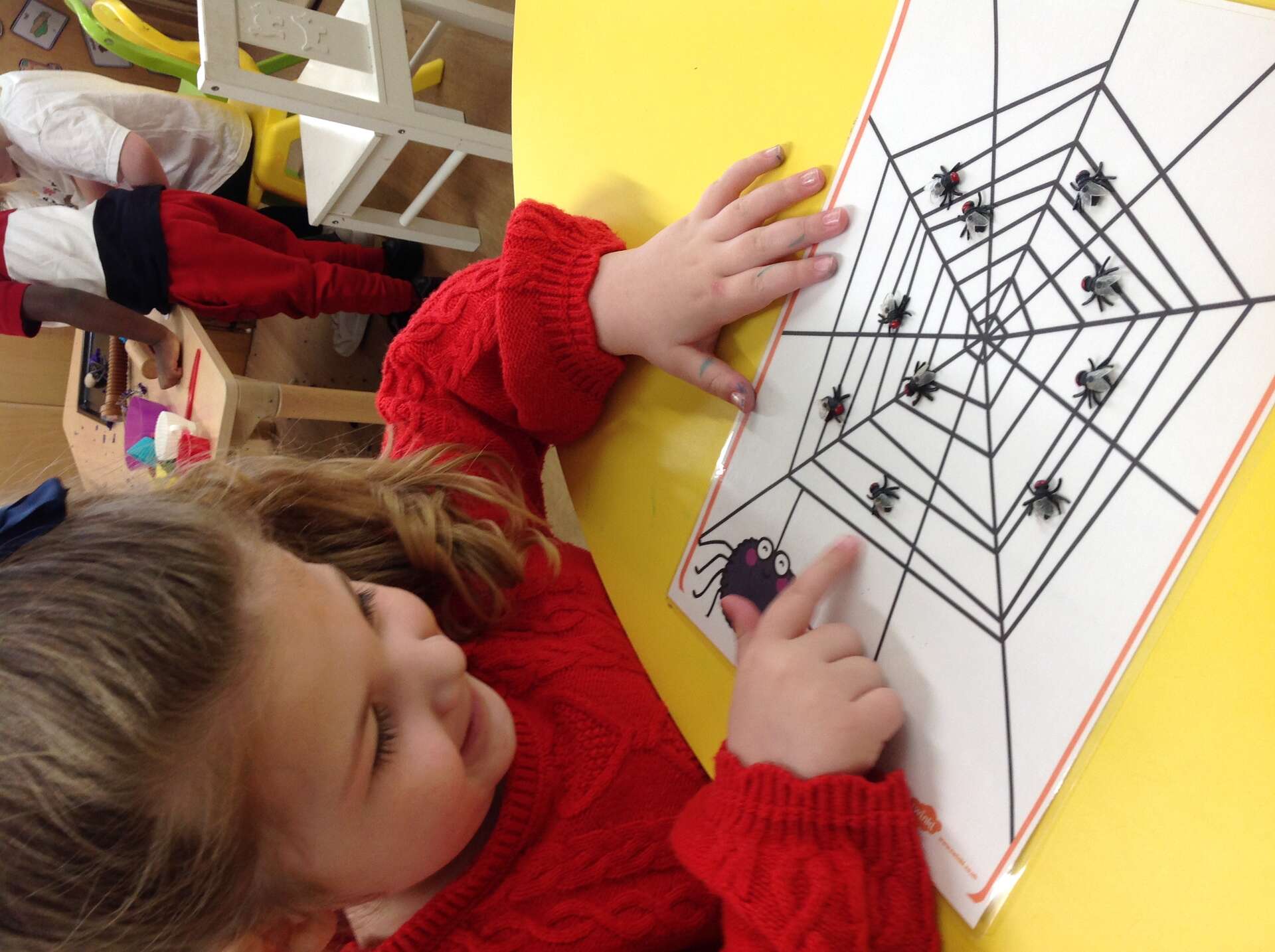 As part of our 'Mad about Minibeasts' topic we have been learning all about spiders. We went on a spider hunt around the garden and managed to find a few. We put them into the magnifying tubs to have a closer look. We did lots of fun activities related to spiders such as ordering spiders by size, counting flies in the webs and sliding spiders down the drain pipe onto the numbers. We loved singing Incy Wincy spider, one of our favourite nursery rhymes. The children are all showing such an interest in different minibeasts.