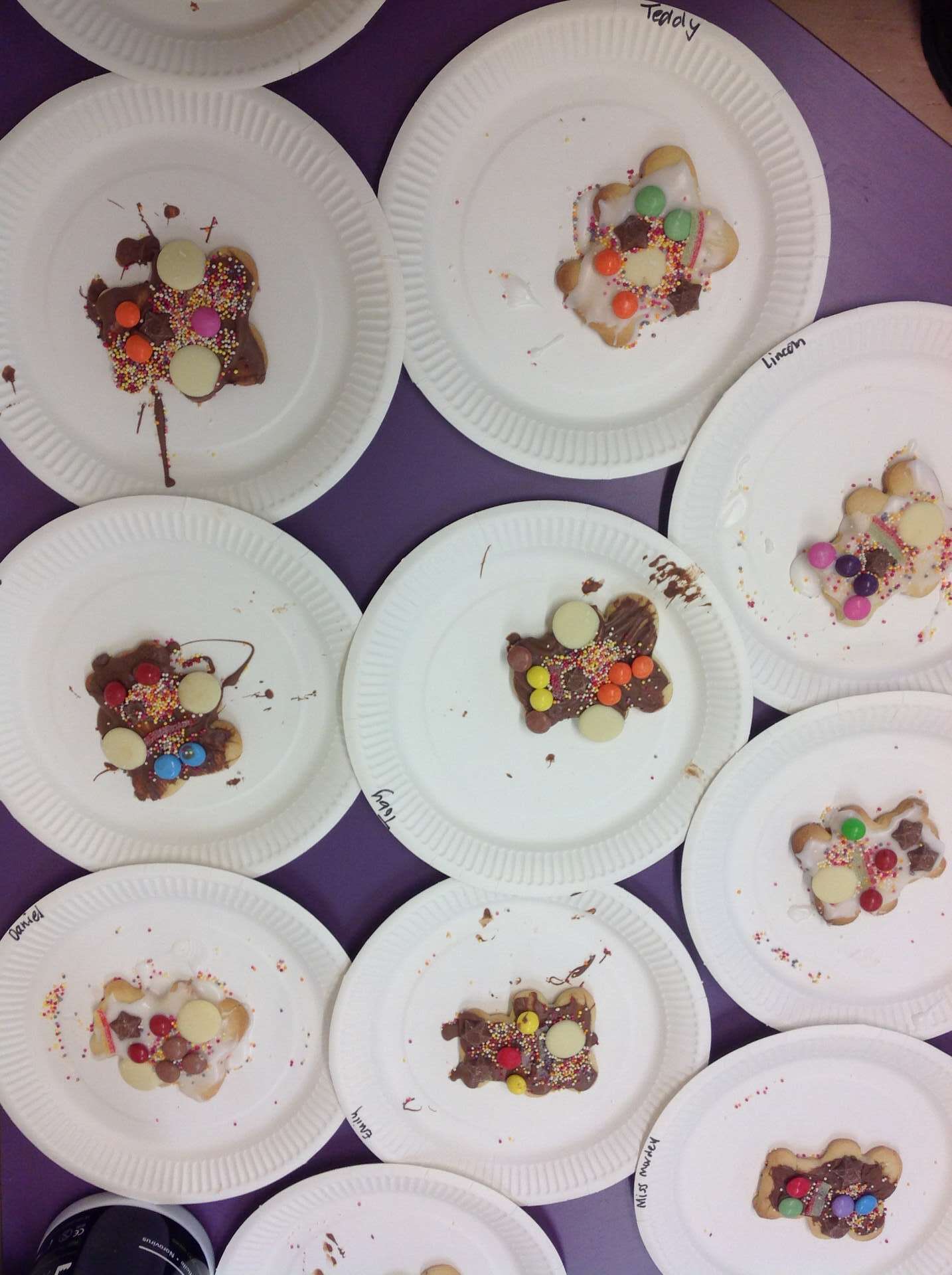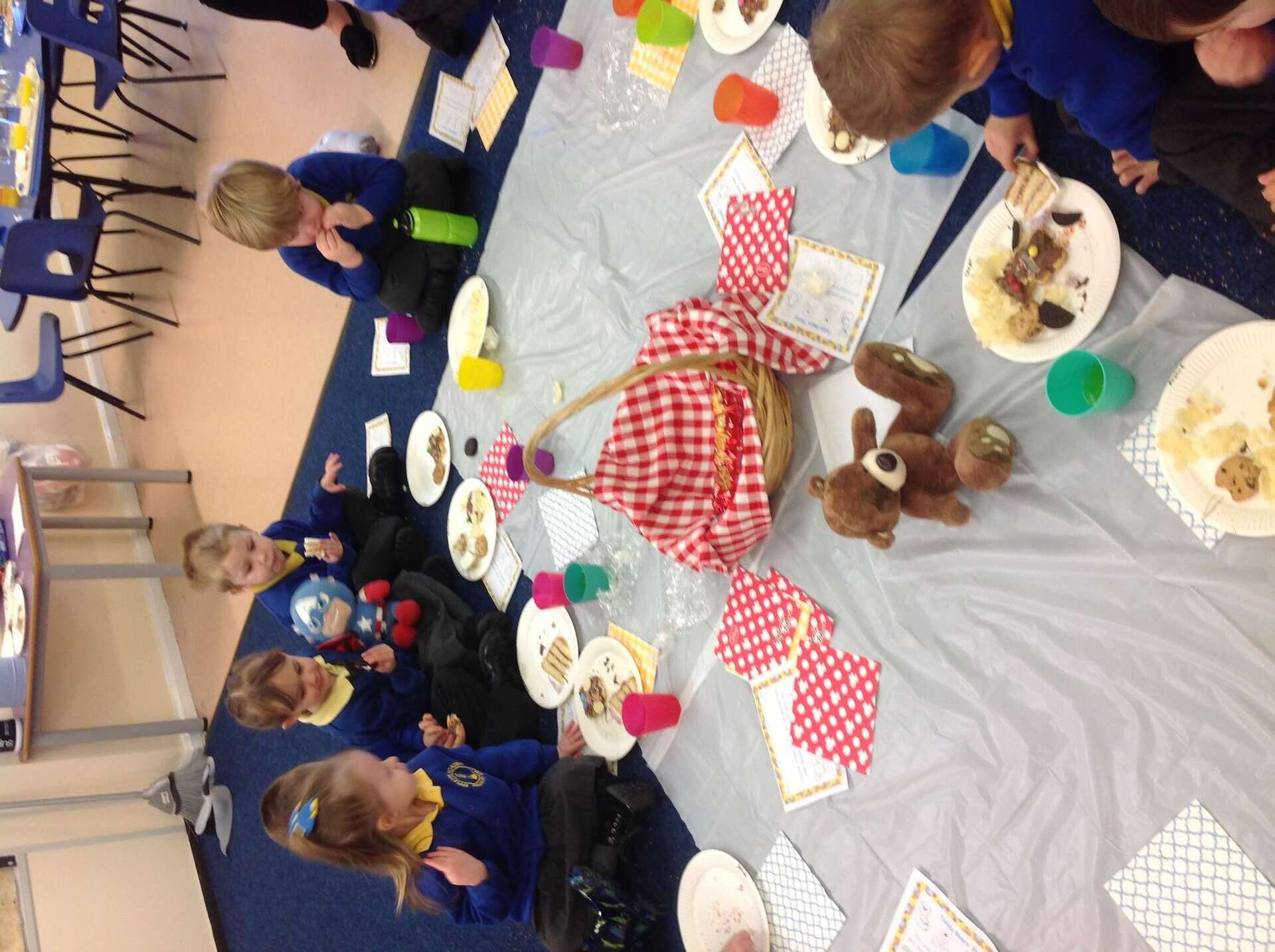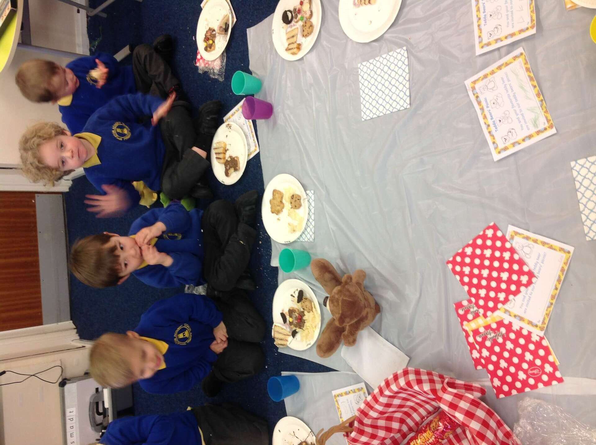 The celebrate all of the wonderful work we have done during our topic ‘Toys and Bears,’ we had a lovely teddy bears’ picnic. The children helped prepare for the picnic by making decorations, writing invitations and decorating their own teddy bear biscuits. Just as we were about to begin our teddy bears’ picnic we found that all of the teddy bears had disappeared so we had to go on a bear hunt to find them all. We enjoyed sitting together to share snacks. Our teddy bear biscuits were delicious.