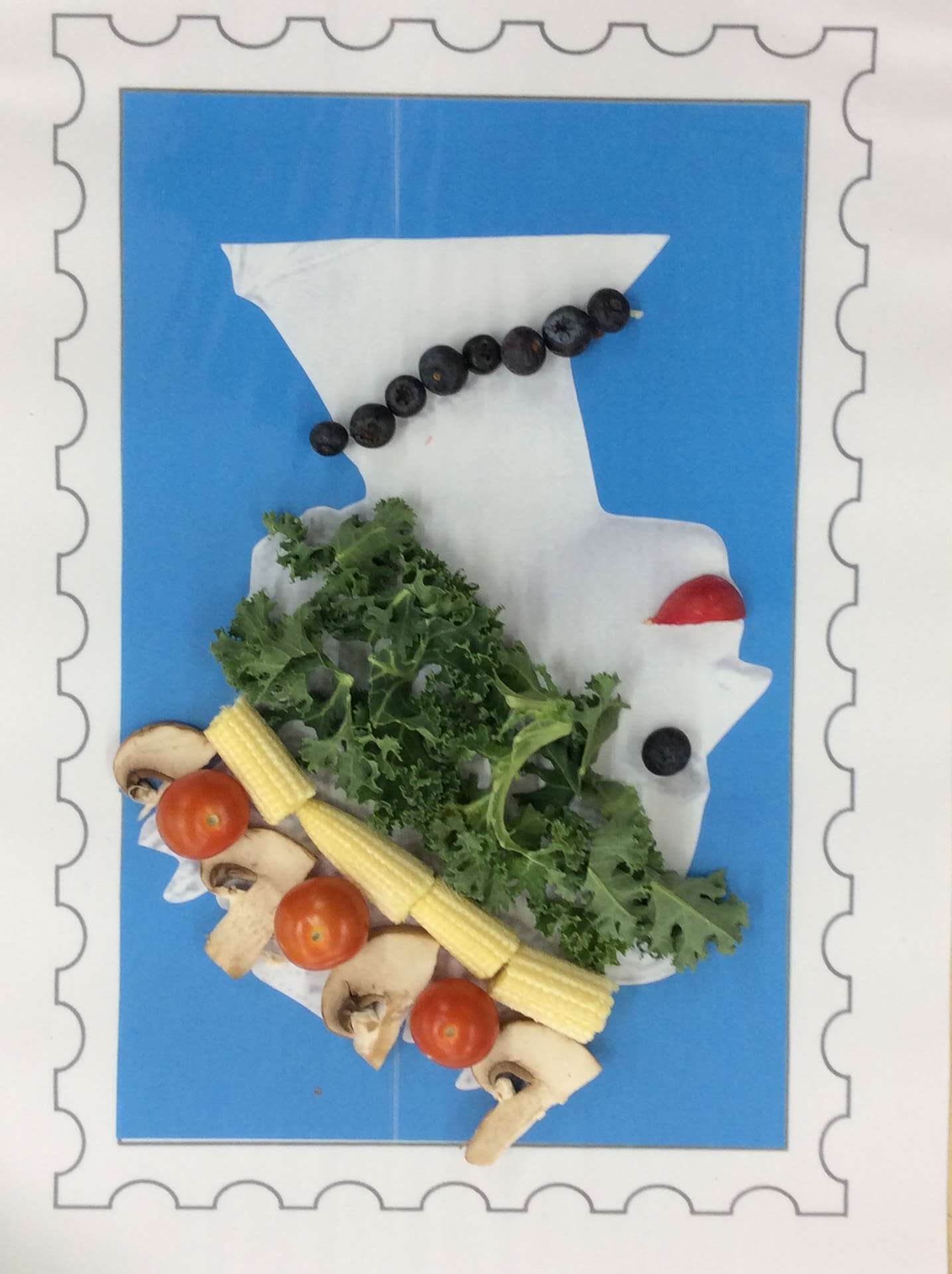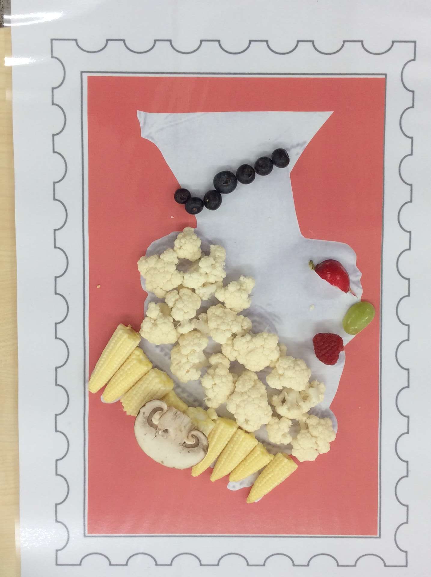 We created postage stamps featuring Queen Elizabeth in the style of the Italian artist Giuseppe Arcimboldo for our Jubilee celebrations. We used fruit and vegetables to create vegetable portraits.