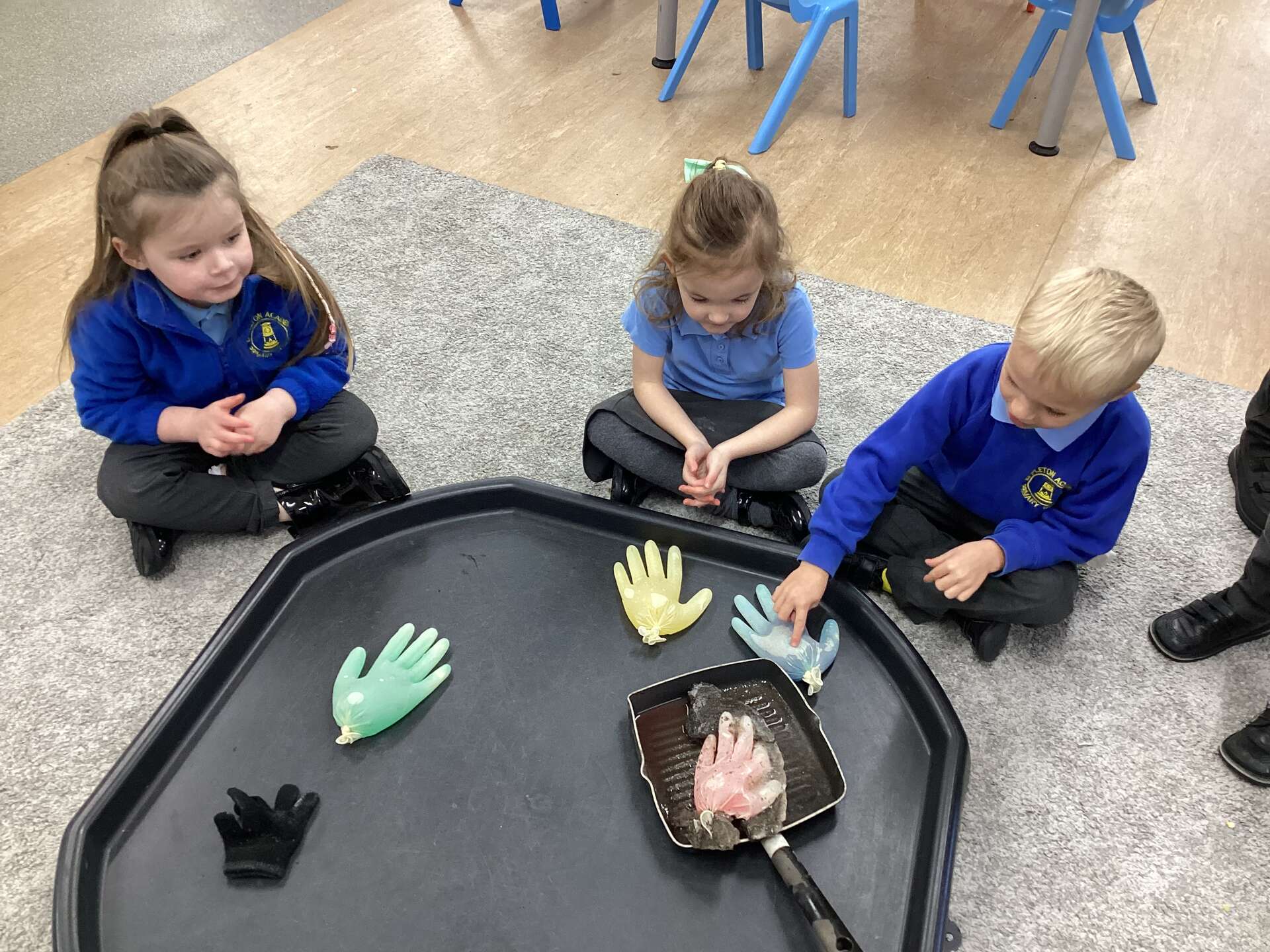 It has been so cold that we found lots of thick ice in the garden so we investigated what would happen if we filled gloves with water and left them outside over night. We found them the next day frozen solid then we took one inside and left one outside to see what would happen.