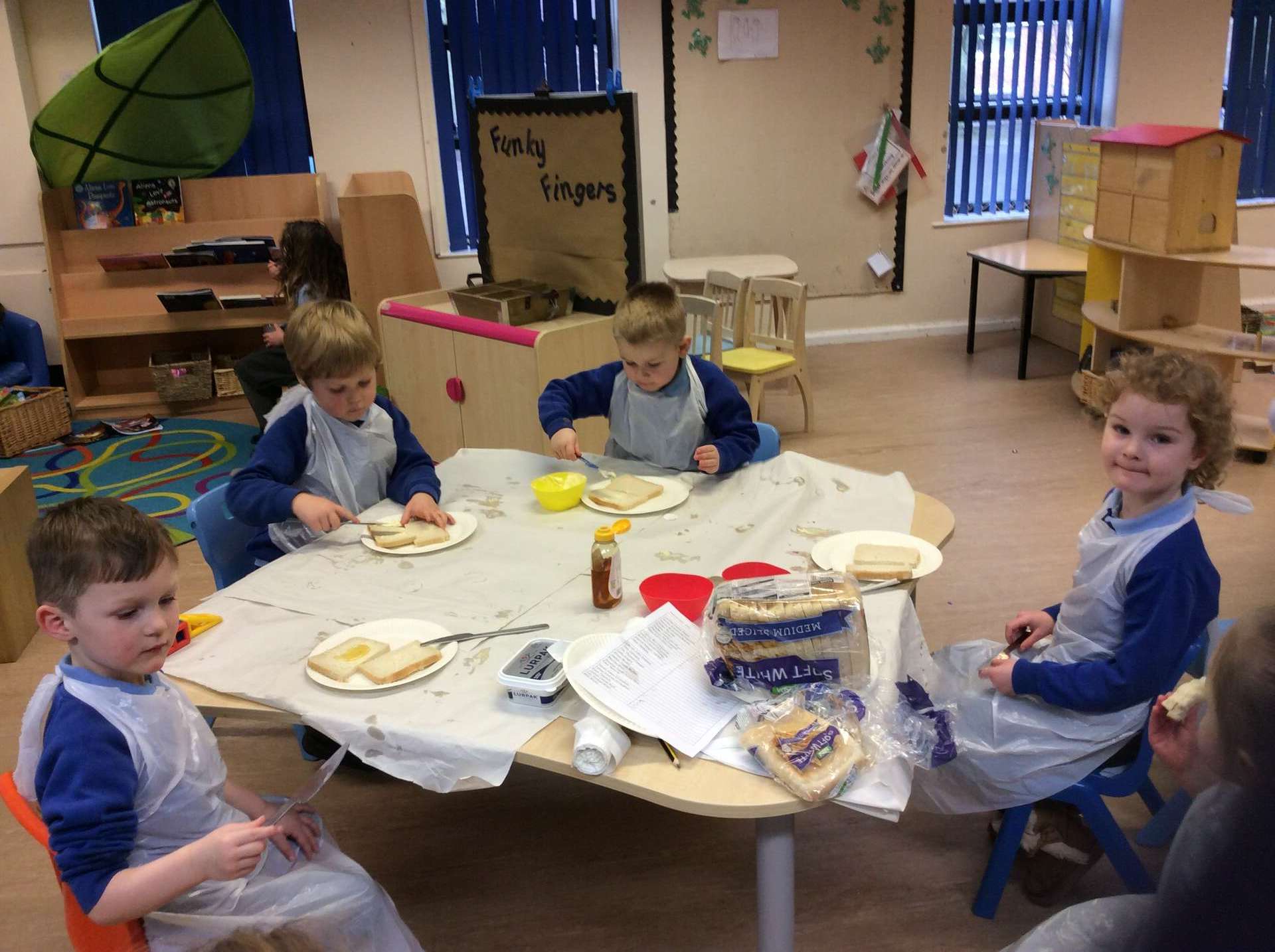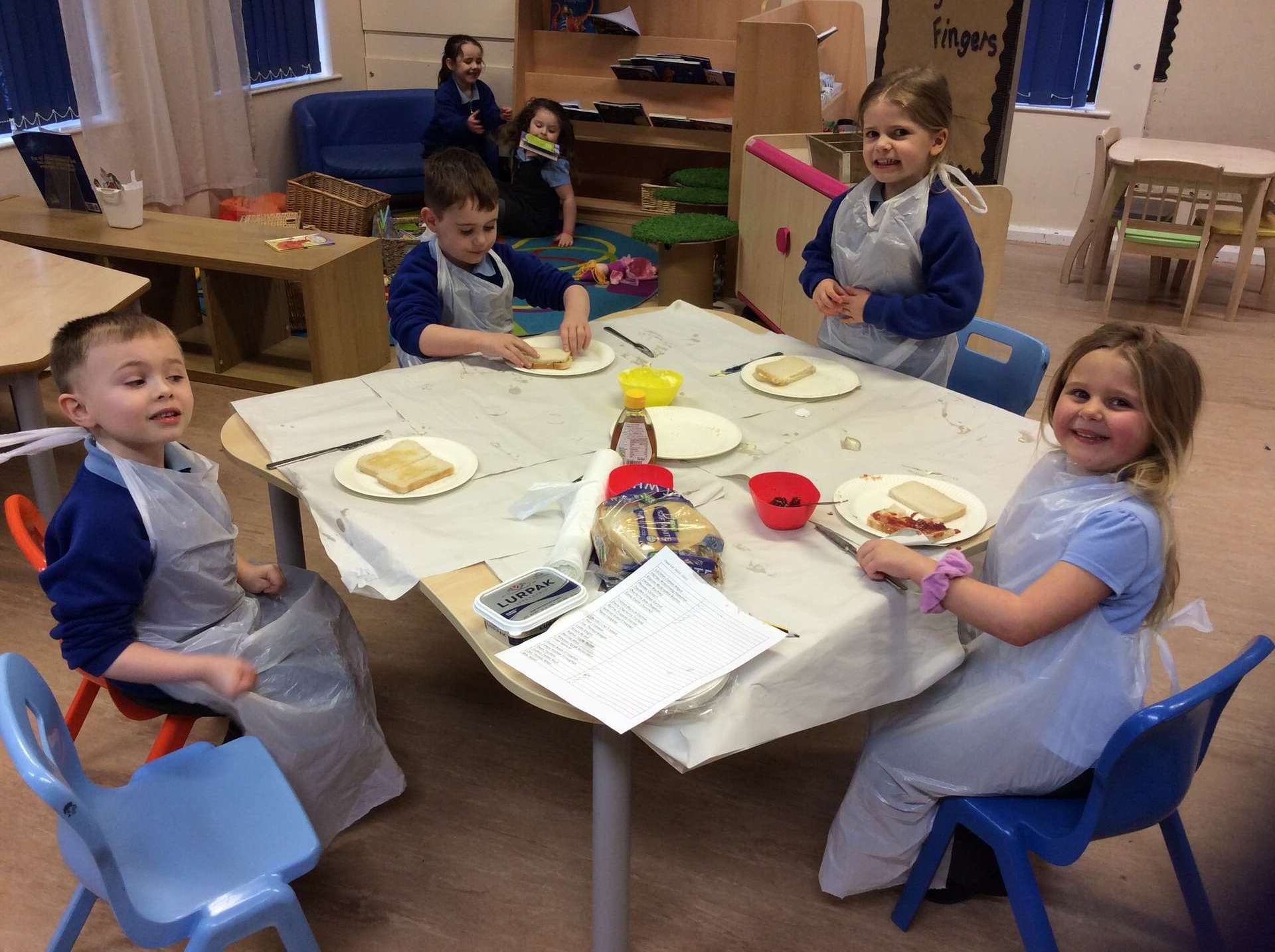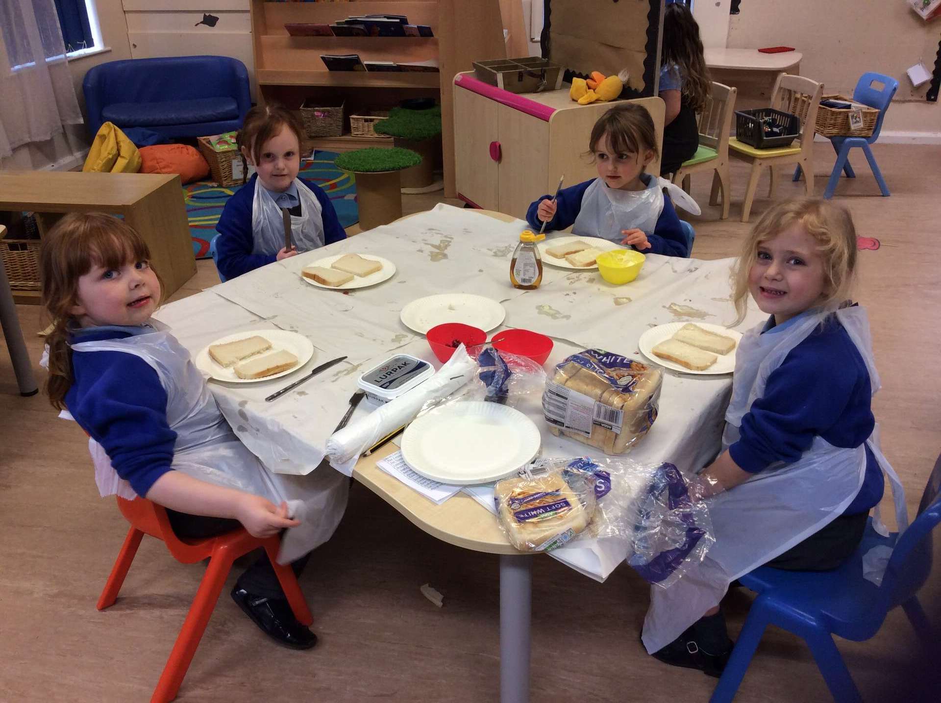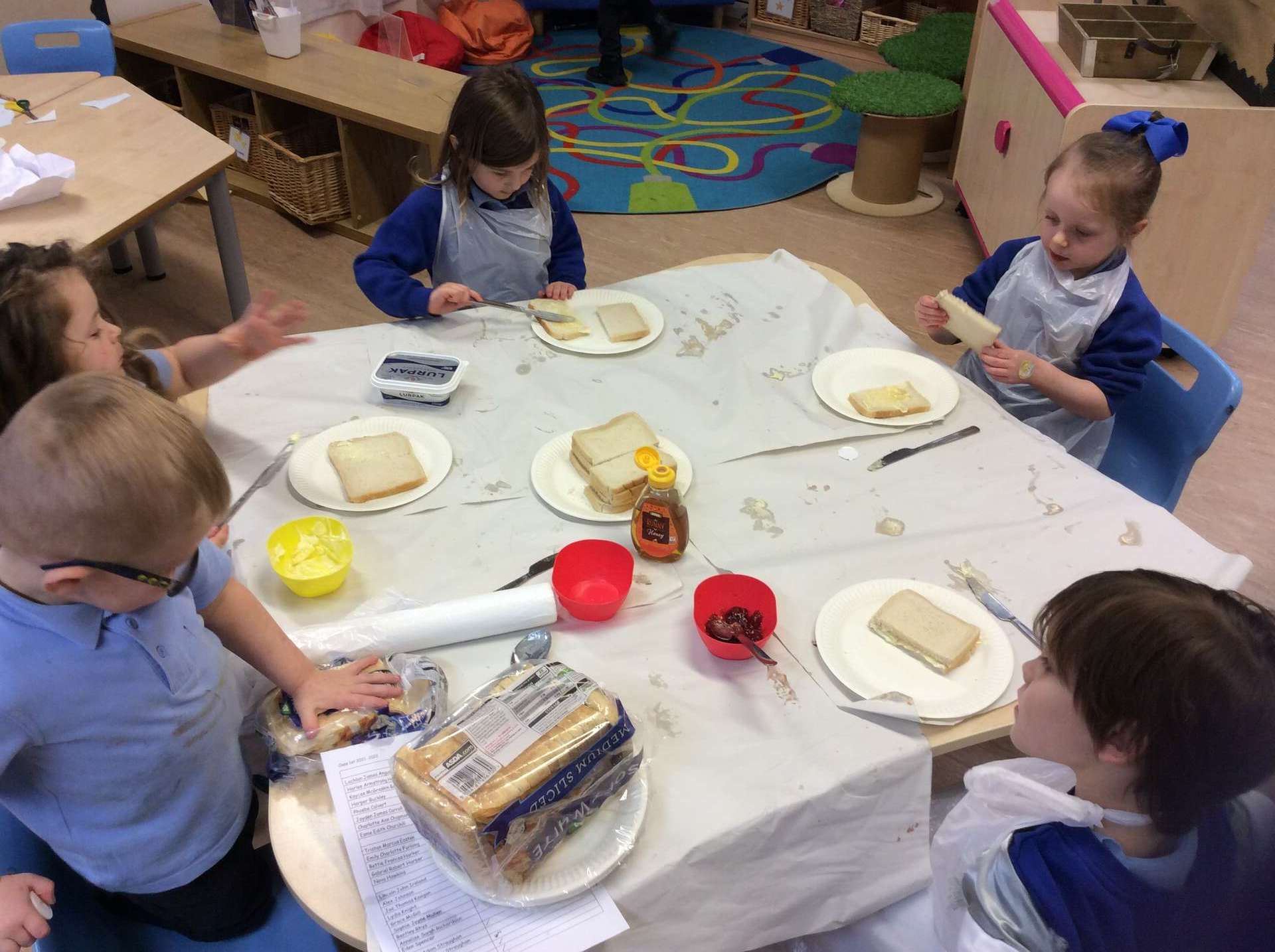 We followed instructions in the right order to make either a jam or honey sandwich for Baby Bear to take to the moon. We found out by counting that honey was the most popular choice.
