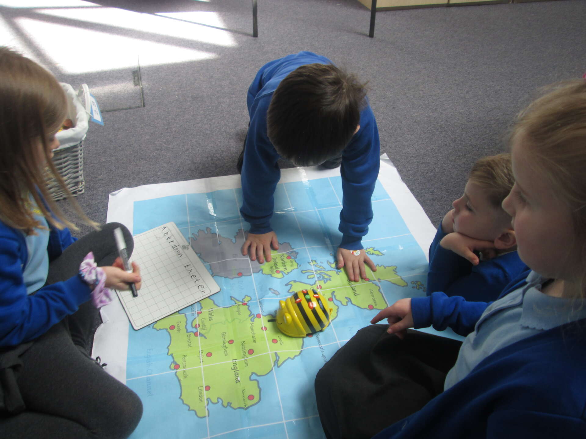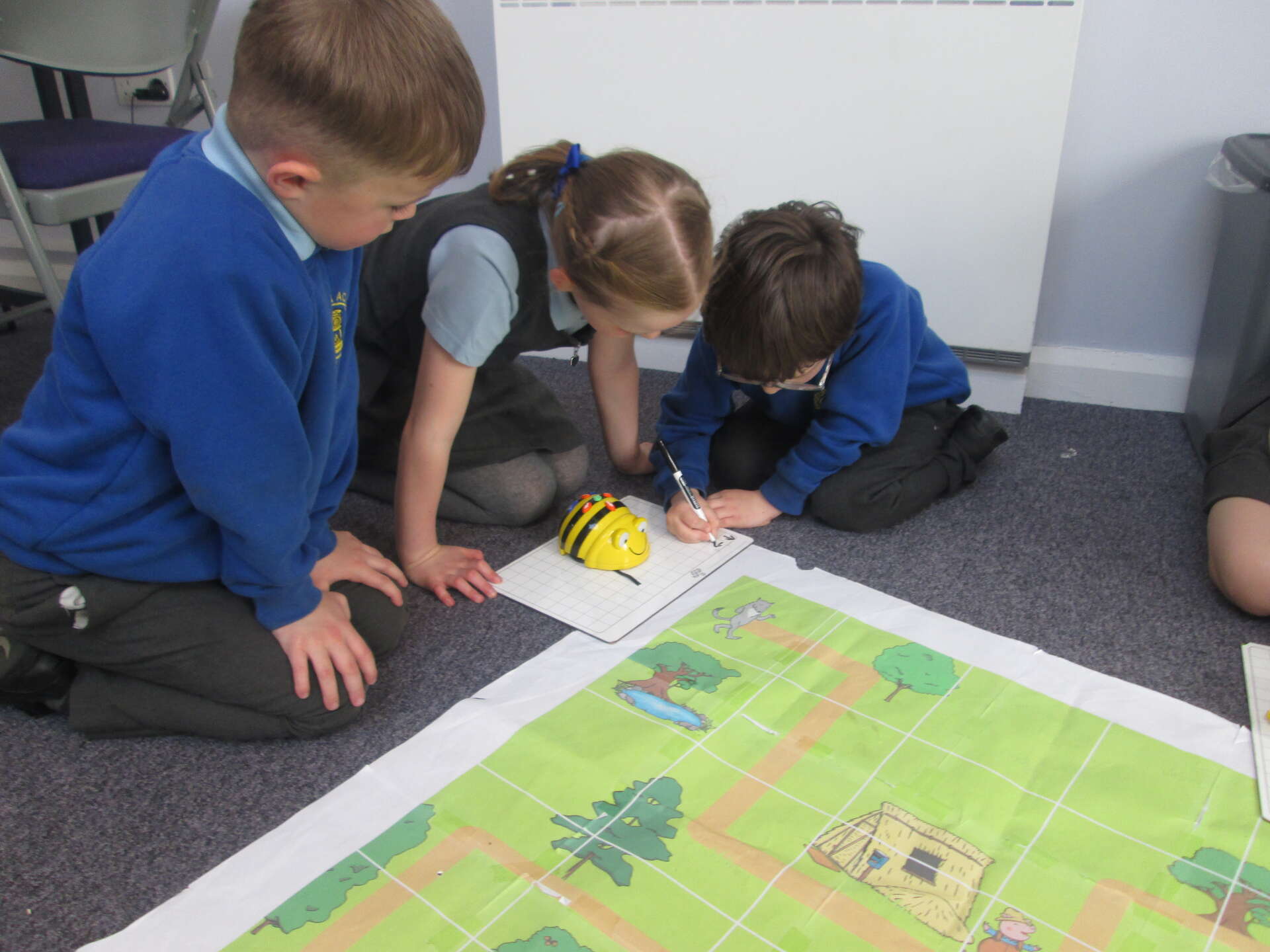 We used the arrows on the beebot to make a simple algorithm and wrote the algorithm on a whiteboard to record it. Then we programmed the beebot to follow the algorithm and move around a route. We debugged the program to get the route correct when the beebot did not end up where we thought it would!