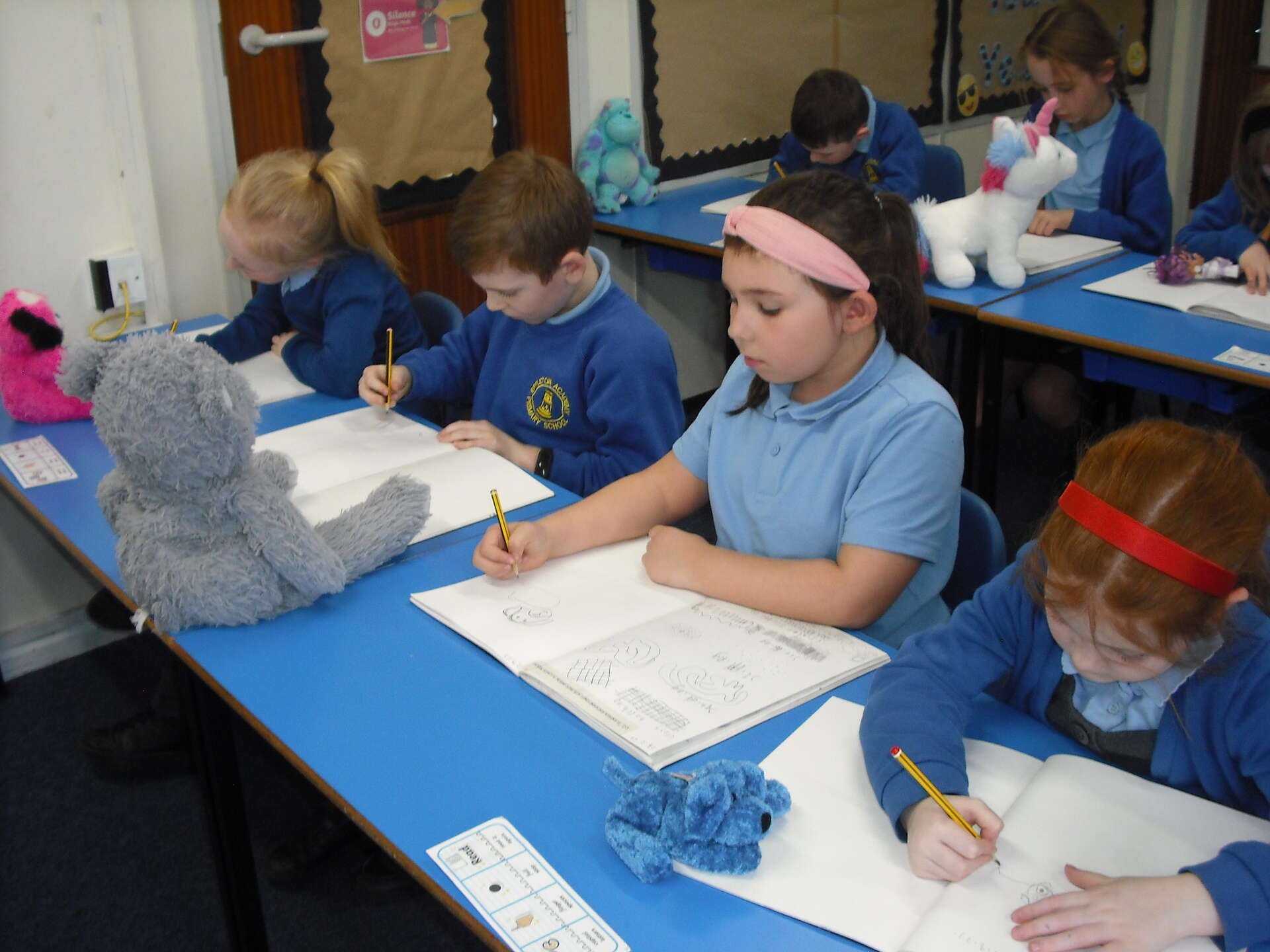 As part of their art work , Year Two have been working on their drawing skills.. This week, everybody had to bring in a soft toy from home. The children had to feel the texture of their toy and use their observational skills to draw.