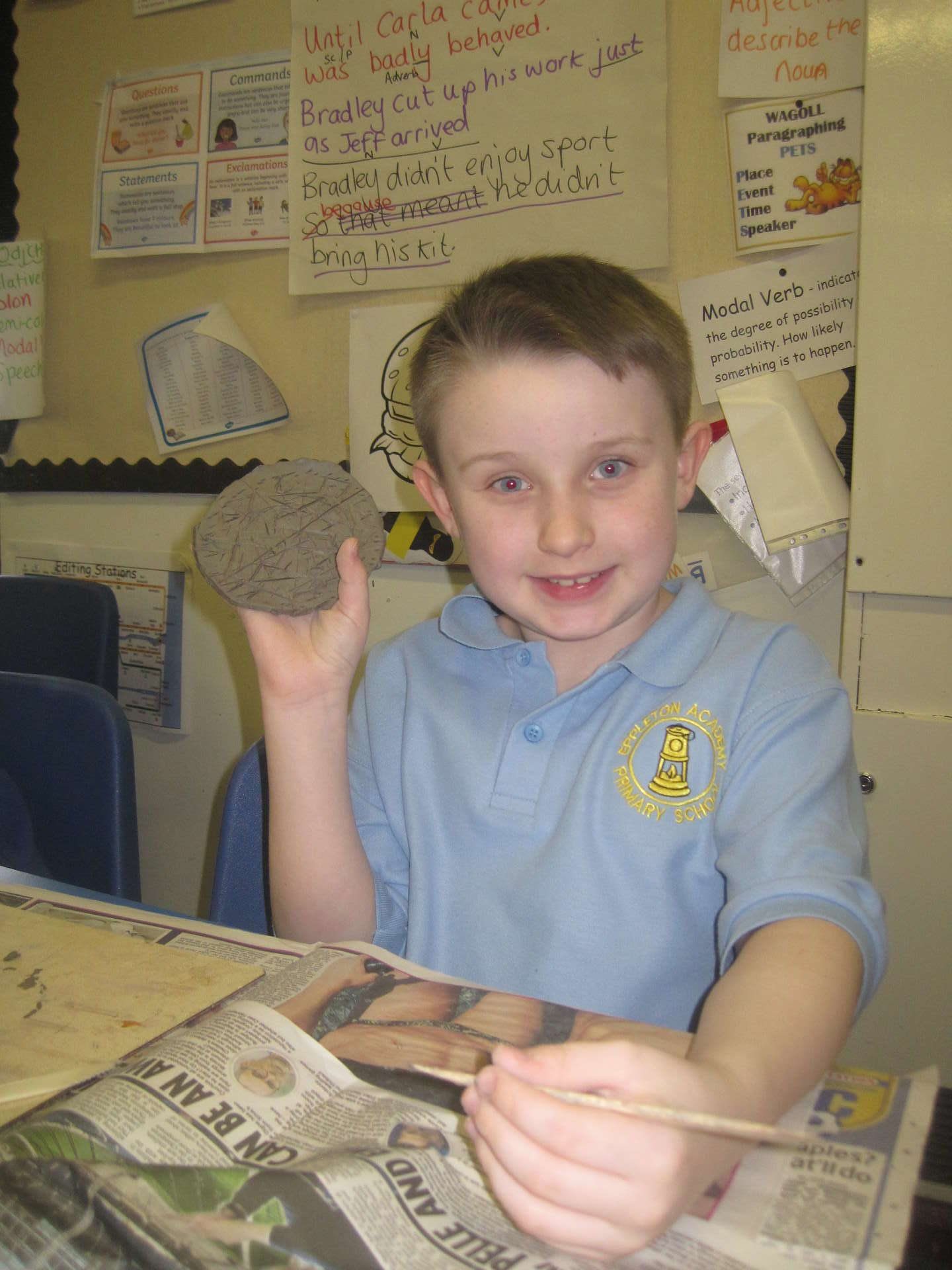 We have been creating some Anglo-Saxon inspired artwork. We looked at pictures of artefacts that were from the Anglo-Saxon era and how they were decorated. We then looked at a more modern artist who creates patterns using tessellation. We designed and created small, decorative shields or broaches. We made them out of air-drying clay using a range of clay tools. We used brushes, craft knives and dowelling to create our designs. We then learned about the properties of acrylic paint; we learned about its consistency, that it is used for a range of materials rather than paper and also that it is waterproof. We used our design sheets and also our knowledge of Anglo-Saxon artefacts to paint our clay art work. We also learned about the importance of choosing the correct brush size and thickness in order to be accurate and neat when we are painting. Here are some photos of us in action: